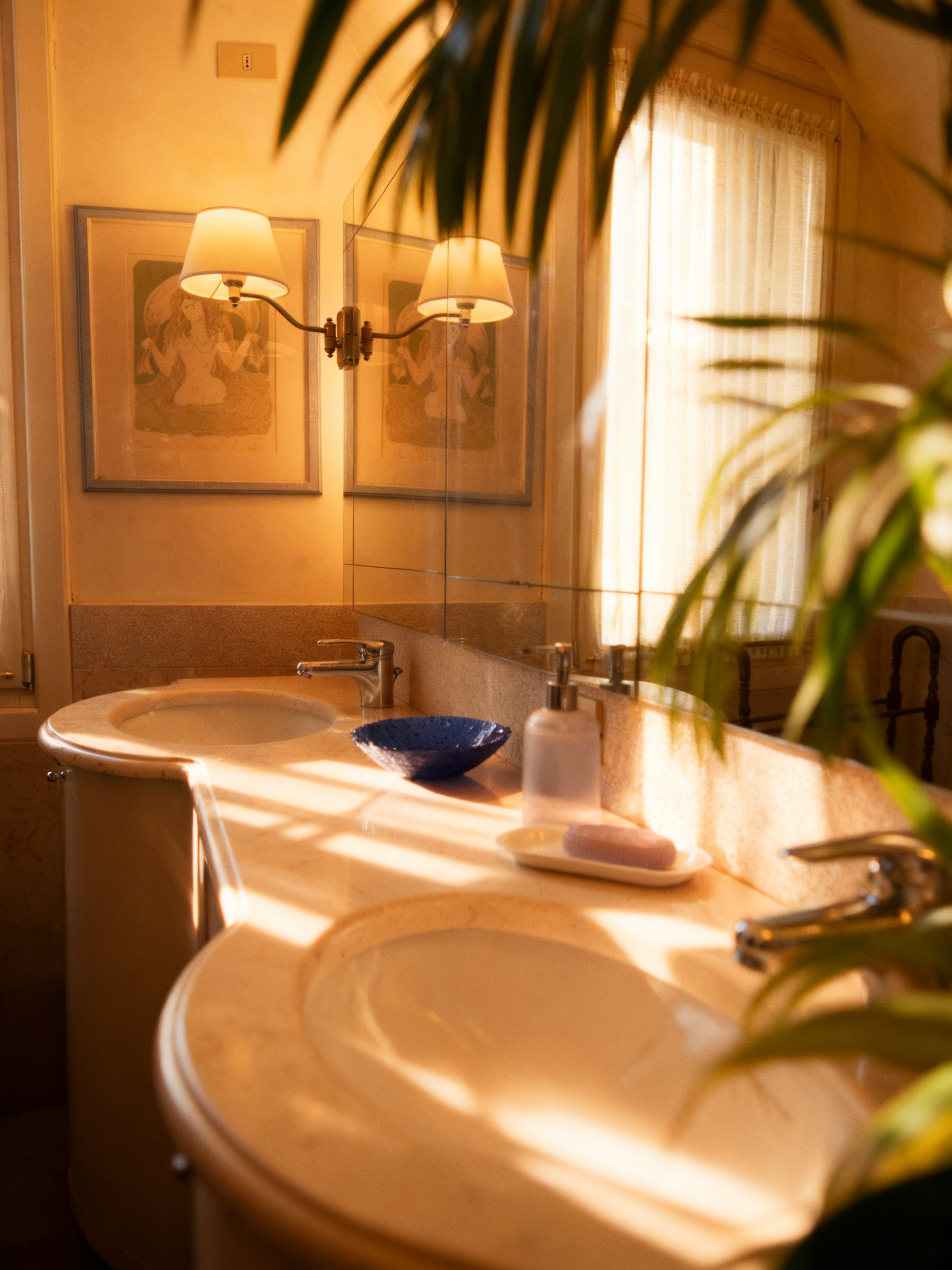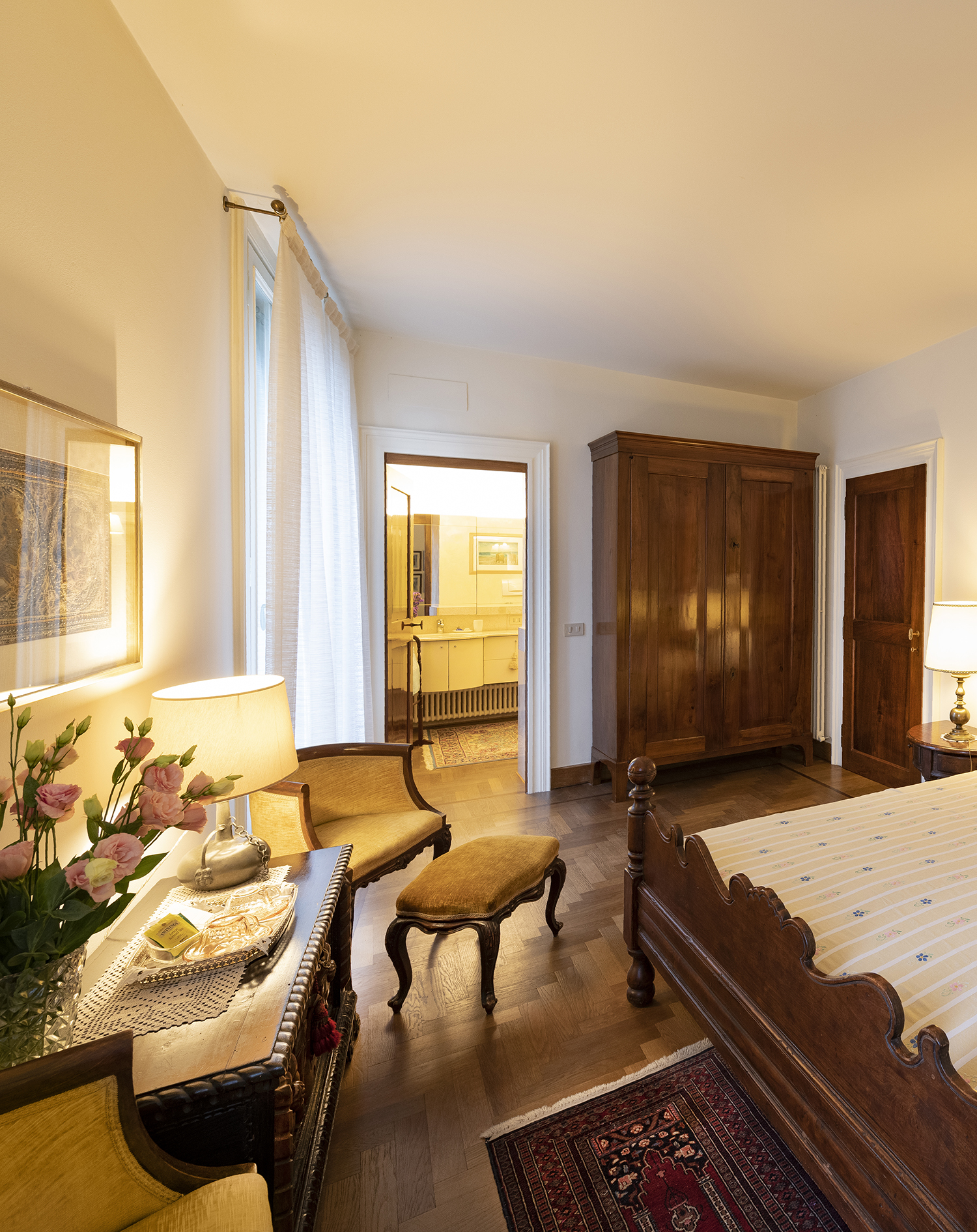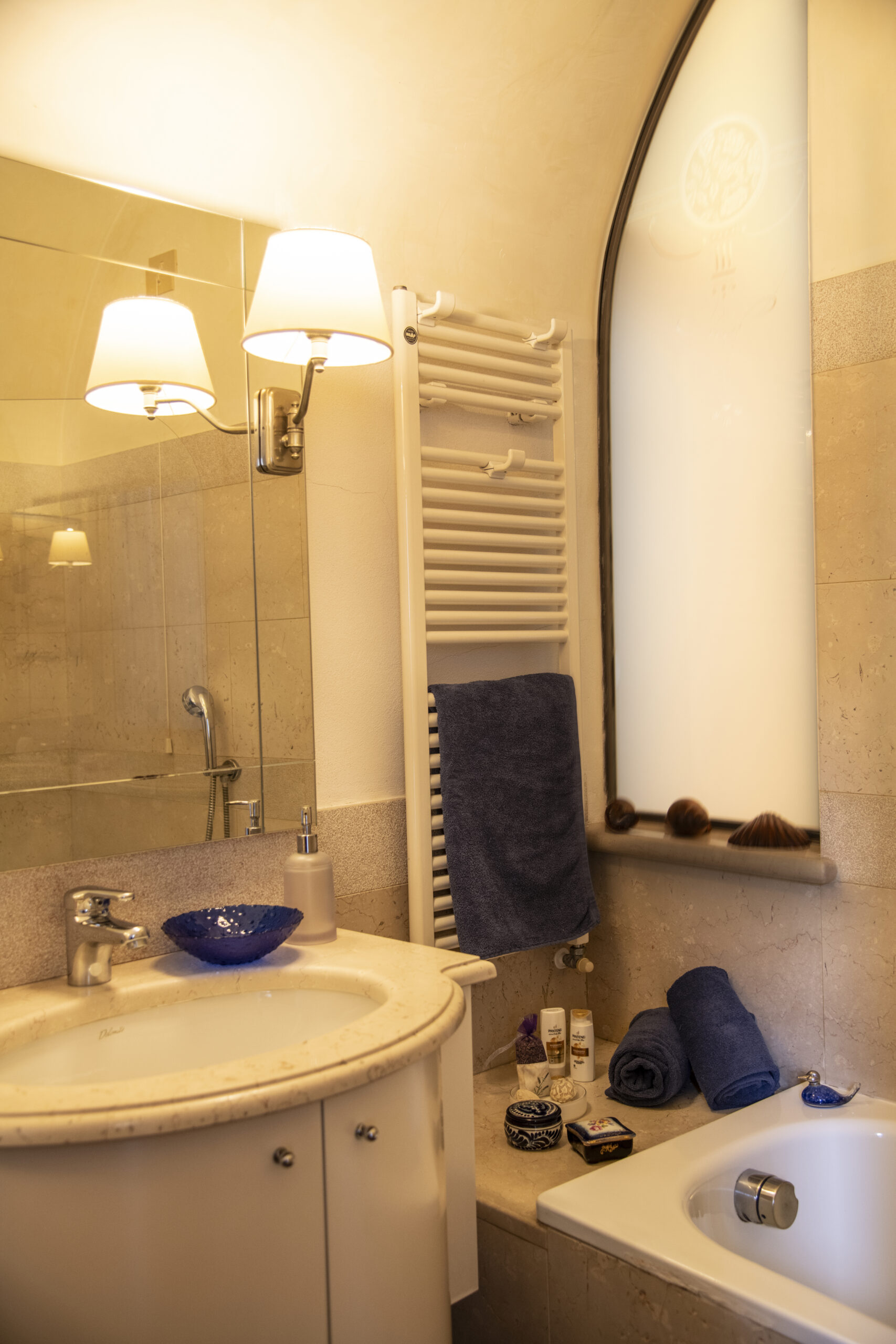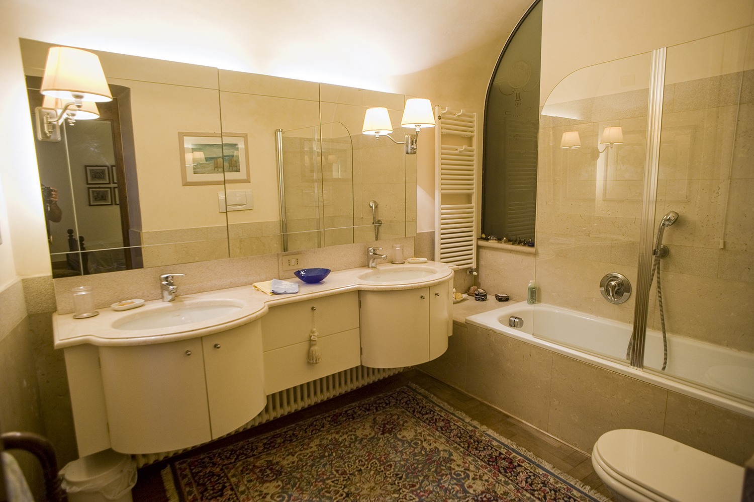 Il bagno, con accesso direttamente dalla camera, è provvisto di doccia, vasca, doppio lavabo e ha un’ampia finestra sempre sul fiume.