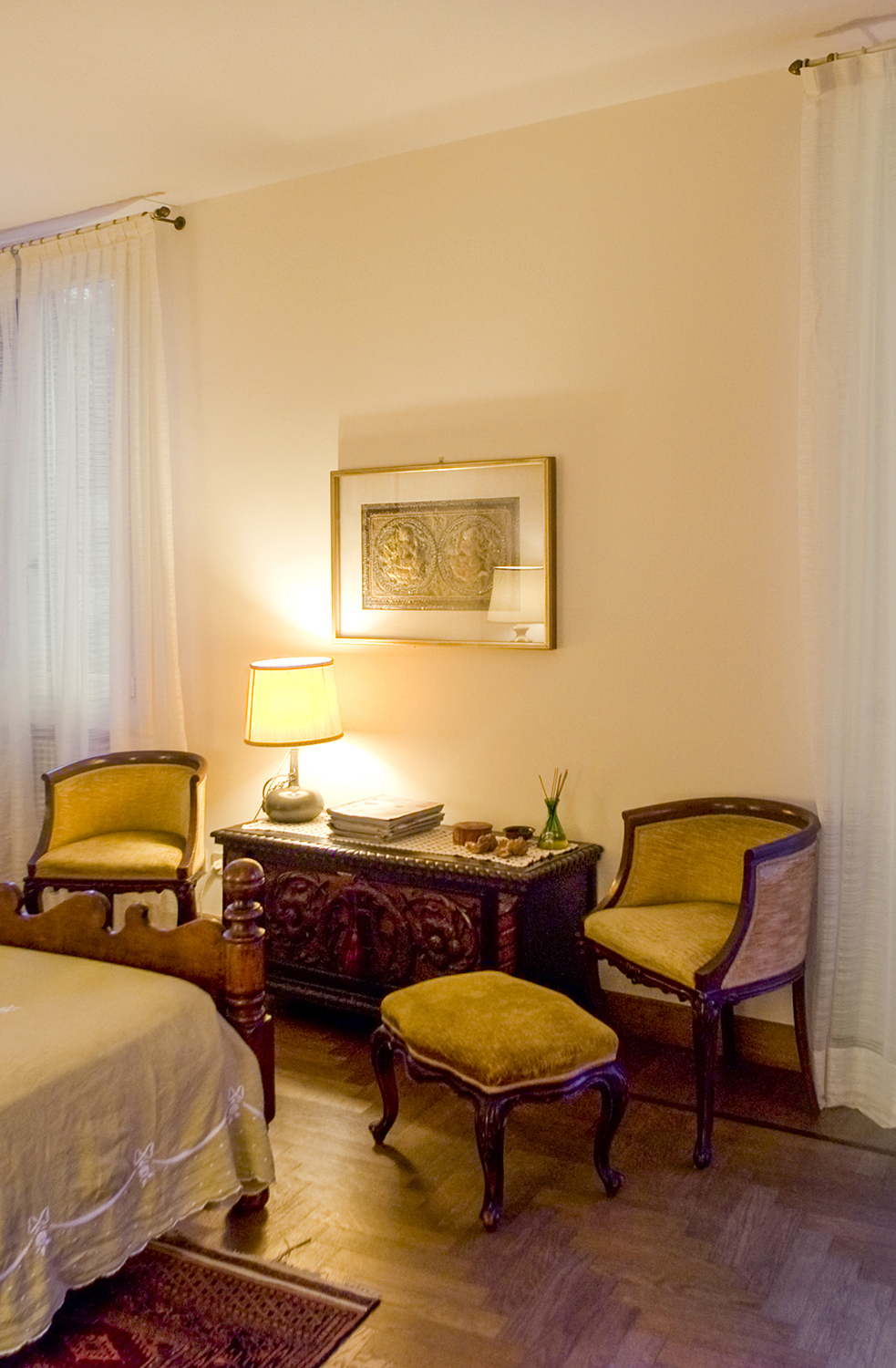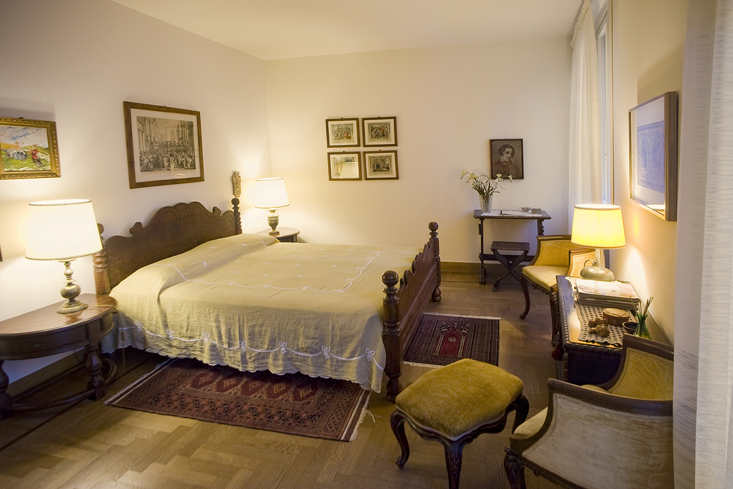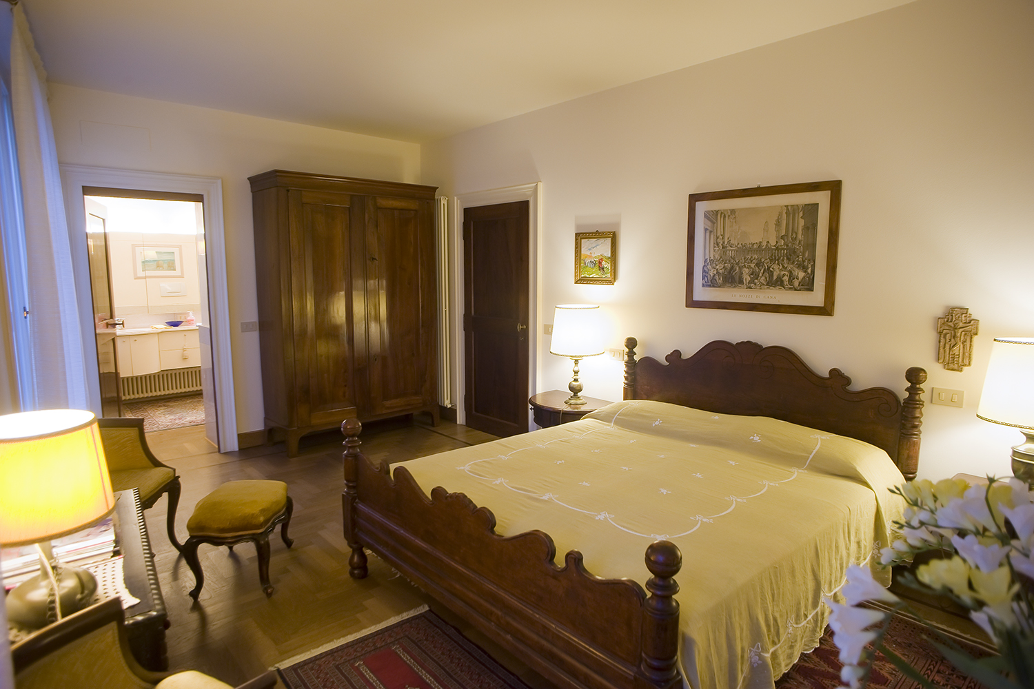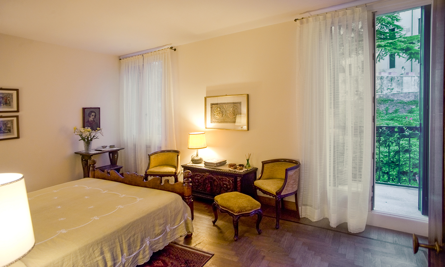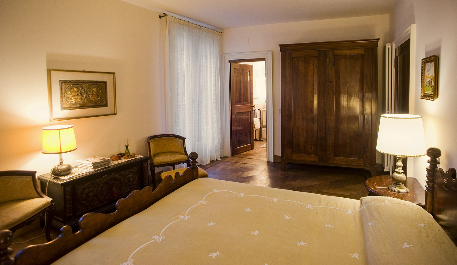 La camera matrimoniale molto ampia e luminosa ha una finestra e un balconcino fiorito che si affacciano sul fiume ed è molto silenziosa:
